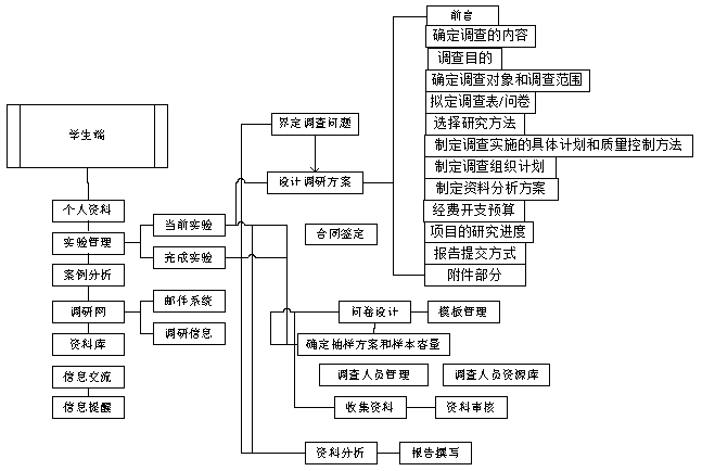 在(zai)(zai)學生端系(xi)統,學生根據(ju)教師(shi)設(she)置的實驗(yan)環境(jing)確定調(diao)研(yan)課題,按步(bu)驟(zou)完成(cheng)市(shi)(shi)場(chang)調(diao)研(yan)設(she)計(ji)(ji)方(fang)案(an)、調(diao)查(cha)(cha)(cha)問卷,確定調(diao)查(cha)(cha)(cha)人員,收(shou)集及分(fen)(fen)析(xi)(xi)調(diao)研(yan)資料(liao),撰寫調(diao)研(yan)報告。完成(cheng)教師(shi)布置的在(zai)(zai)線作(zuo)業(ye)及案(an)例分(fen)(fen)析(xi)(xi)。系(xi)統提(ti)供一個市(shi)(shi)場(chang)調(diao)研(yan)網(wang)站,學生可以把設(she)計(ji)(ji)的調(diao)查(cha)(cha)(cha)問卷在(zai)(zai)這里進行發布以收(shou)集資料(liao),或通過(guo)電子郵件方(fang)式向參加本次實驗(yan)的本班其它同學,發送問卷郵件以收(shou)集資料(liao)。系(xi)統界面設(she)計(ji)(ji)美觀形(xing)象,將復雜的功能配(pei)以人性化的操作(zuo)步(bu)驟(zou)設(she)計(ji)(ji),能盡(jin)快幫助用戶掌握其方(fang)法及步(bu)驟(zou)